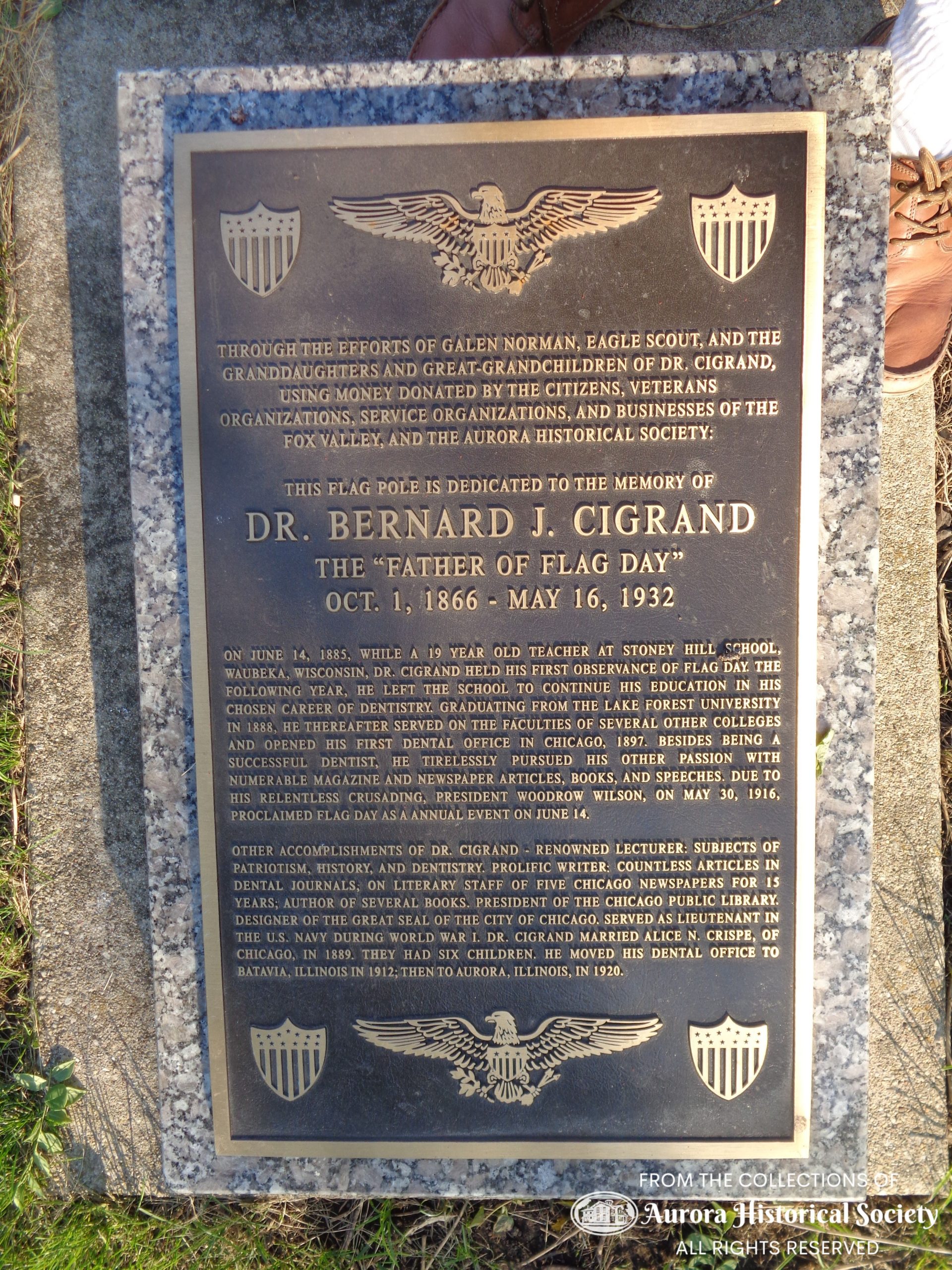 After residing and practicing dentistry in Chicago for many years, Cigrand moved to the Fox Valley, building a home in Batavia in 1912. In 1920, he moved his dental offices from his home to downtown Aurora, where he went into practice with his son, Elroy.